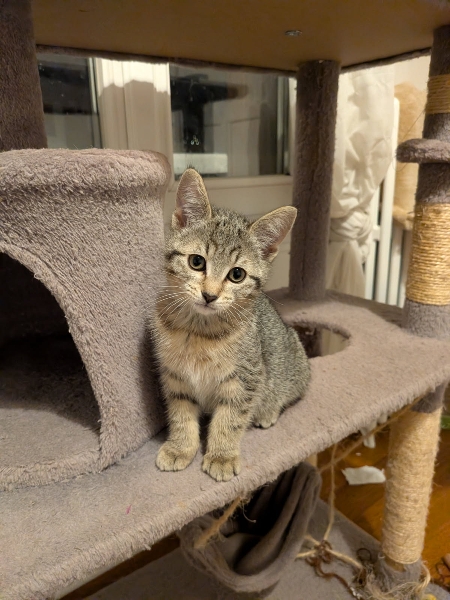 Ravissante chatonne tigrée au pelage tout doux, Flamme est un peu plus réservée que sa soeur Etoile mais toute aussi adorable! Joueuse et ronronnante à souhait !Cette chatonne est très jeune donc une disponibilité et présence de ses adoptants sont souhaitables afin qu elle s 'épanouisse dans les meilleures conditions.Elle est visible chez Alice à St Maur..Il est indispensable de compléter le formulaire de pré-adoption