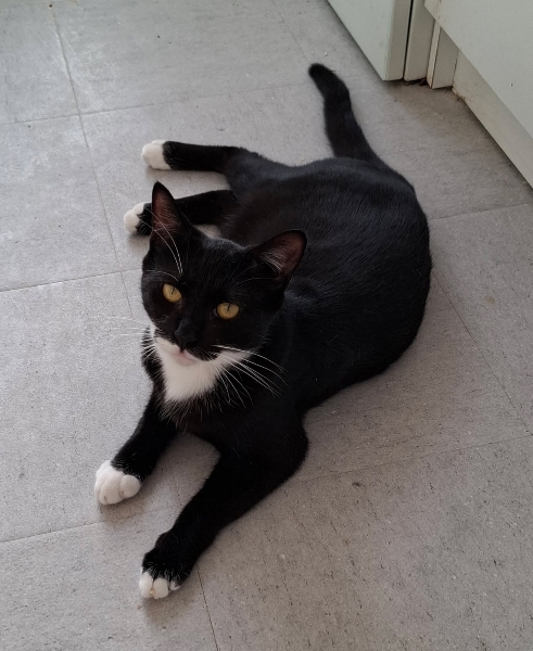 Jeune et élégant chat noir avec plastron et chaussettes blanches . Il est sociable car habitué à la vie en collectivité . Encore jeune, il est joueur mais plutôt placide et gentil . Il recherche une bonne famille d adoption aimante et responsable. Il est visible chez Isabelle à Bonneuil et attend une super famille aimante , disponible et responsable .