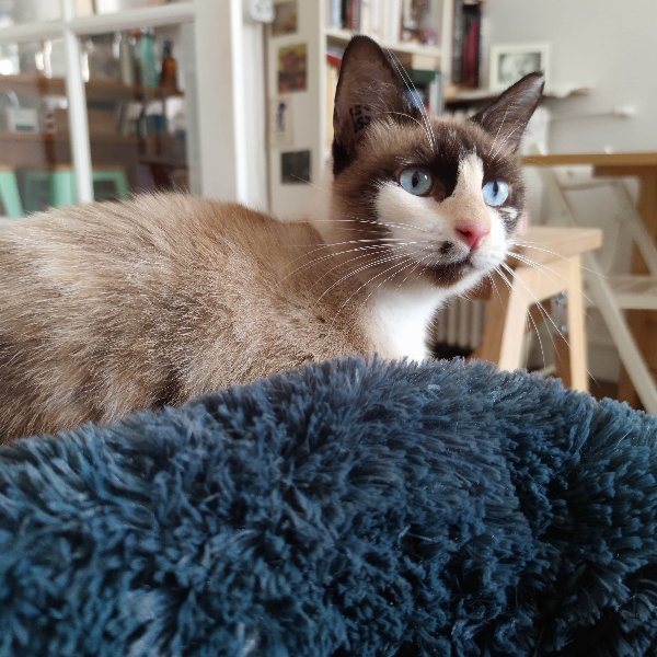 Cette très jolie matoune n' est pas sans évoquer la race peu connue de Snowshoes dont elle a quasiment toutes les caractéristiques avec ses yeux turquoise Magnifique certes mais pas que"Pomme est sans doute l'un des chats les plus câlins du monde. Elle adore se faire caresser et il ne lui faut pas beaucoup de temps pour présenter le ventre et devenir un petit moteur à ronrons !