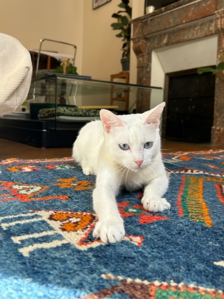 Kalina est une ravissante minette toute blanche aux yeux bleus, non sourde." Elle est adorable, très attachante, adore les caresses et est très joueuse. Elle demande beaucoup d attention et une relation avec ses humains. Elle mange bien et est très propre . Si vous cherchez un chat pour votre foyer Kalina sera très heureuse d en faire partie ." Elle est visible chez Eloise à Paris 75011.
